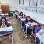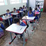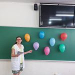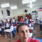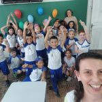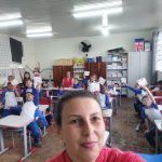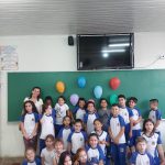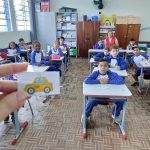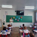 Em sala de aula realizamos a atividade Bingo do Trânsito. A cartela do bingo tinha meios de transporte e algumas placas de trânsito. Conversamos sobre as imagens e seus significados, em seguida confeccionaram bolinhas de papel para marcar. Cada aluno ganhou 1 cartela para participar e a professora cantava as peças. Para melhor entendimento os educandos realizaram a leitura da revista, e como na mesma a esfinge enviava mensagens com a Inteligência Artificial foram utilizados balões representando as mensagens, nos balões escrevi as mensagens de Segurança no trânsito, com a caneta Posca.