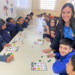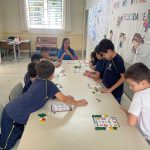 A educadora organizou o Bingo do Trânsito e utilizou uma mesa grande para que todos os alunos pudessem jogar confortavelmente. Antes do início do jogo, a educadora conversou com os alunos sobre como cada um pode colaborar no trânsito, destacando que todos têm um papel fundamental para torná-lo mais seguro.