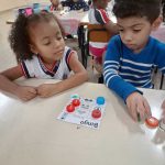 Em seguida explicamos que faríamos um bingo. Apresentamos as cartelas do bingo contendo 9 figuras com meios de transporte terrestres, sinalizações como semáforo, algumas placas, e as figuras que seriam sorteadas. Combinamos as regras e dentre elas a necessidade de escuta atenta, atenção nas figuras, falar pouco, etc. Um massinha foi direcionada como prêmio.