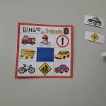 Cada criança recebeu uma cartela com diferentes imagens de transportes e placas, eu fui sorteando as figuras correspondente com as imagens.