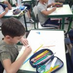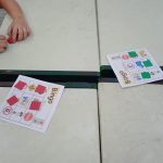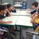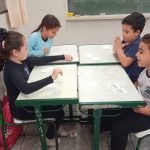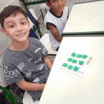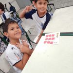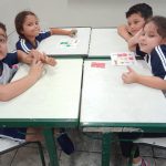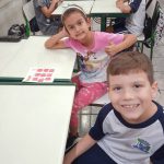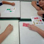 DISTRIBUIÇÃO DAS CARTELAS DE BINGO, UMA PARA CADA DUPLA DE CRIANÇAS.