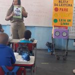 O projeto “Blitz da Leitura: Pare! Pense! Leia um Livro!”Visando impactar as crianças com o projeto blitz da leitura foi desenvolvido para levar os pequeninos a criarem o hábito pela leitura e dentro deste contexto vivenciarem alguns valores que andam adormecidos na sociedade :como a partilha,o amor e principalmente o espírito coletivo ressaltando o não a violência. A professora entrou nas turmas com o carrinho ao som de uma sirene 🚨 levando histórias, informações sobre trânsito seguro e muita alegria. O carrinho ficou estacionado no pátio da escola parando os alunos para ler histórias na blitz.