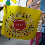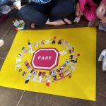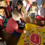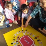 Em seguida voltamos à sala de aula para procurar letras para recorte em revistas formando a frase “Respeito no trânsito” e fazendo a colagem. Explicamos que a placa do meio era Pare. Usaram pinceis com tinta guache para fazer a cabeça. Por fim pedimos para ilustrar a historia no caderno.