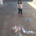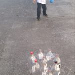 A professora solicitou aos alunos que trouxessem garrafas pet para ser confeccionado o boliche. Em cada garrafa foi colada uma letra e as crianças foram convidadas a contar quantas garrafas derrubaram e, depois, verbalizaram as letras para o grupo. Enquanto brincam de boliche, as crianças estão trabalhando uma série de habilidades motoras. É preciso controlar o movimento de pernas e braços, adequar a força do arremesso da bola e perceber a distância entre elas e as garrafas. Além de promover o desenvolvimento desse esquema corporal, o jogo estimula a percepção visual, a contagem e a linguagem. Durante a brincadeira, eles também exercitam a atenção e o respeito, enquanto esperam sua vez e observam os colegas, aprendendo sobre regras de convivência. O brinquedo confeccionado com recicláveis, além de ajudar a preservar o meio ambiente, contribui para o aprendizado em relação ao desperdício e a poluição.