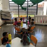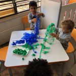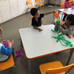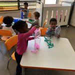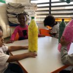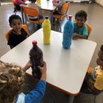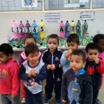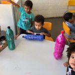 Portanto, os alunos ajudaram a confeccionar os boliches, reutilizando garrafas pet e com papel crepom colorido que serão utilizados nas atividades escolares.