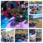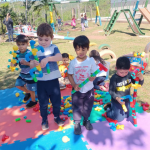 Montei um espaço com tatames perto das árvores e da natureza. Distribui pecinhas de monta monta . As crianças puderam montar elementos da natureza que estavam apreciando: Sol, árvores, flores, pássaros…