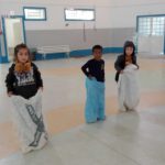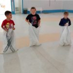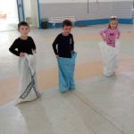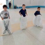 Dialogamos sobre as diferentes brincadeiras que os avós e pais brincavam e, utilizando material reutilizável, no caso sacos de plástico grandes, realizamos a brincadeira de “Pular Saco”, no pátio da escola.