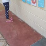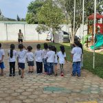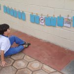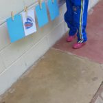 Jogo da memória com imagens dos Meios de transporte e placas de trânsito, confeccionado com imagens e colocados em um varal no alcance das crianças no ambiente externo da Unidade Escolar.
