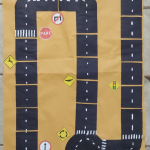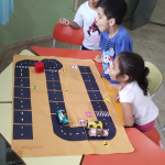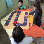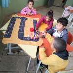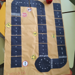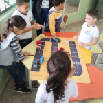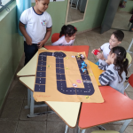 Observação: As ruas do jogo de tabuleiro foi previamente elaborado com o tamanho dos carrinhos, que seriam confeccionados pelos alunos com os rolinhos de papel higiênico.