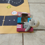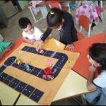 As crianças confeccionaram previamente os carrinhos (com rolinho de papel higiênico) para utilizar as regras de sinalização de trânsito.