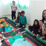 A aula começou com a explicação sobre as sinalizações. Pois na nossa cidade não existe semáforos e faixas de pedestres, além de ter poucas placas de sinalização. Depois disponibilizamos os dedoches dos animais em extinção, fornecidos pelo projeto, explicando o cuidado que devemos ter com a nossa fauna e flora. E os dedoches dos personagens para simbolizar os pedestres. Logo apos os alunos brincaram com os carrinhos, e os dedoches, onde puderam brincar e aprender a respeitar as sinalizações.
