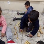 O trabalho com trânsito foi iniciado com roda de conversa sobre os conhecimentos prévios sobre o assunto e uma volta no entorno da escola para observação de vias e sinalizações de trânsito. As atividades sistematizadas em folha sugeridas pelo Projeto Intervias foram realizadas e complementadas com a brincadeira de montar uma cidade (de brinquedo de madeira) e utilizar carrinhos de brinquedo para simular o trânsito. Os alunos foram propondo situações, utilizando placas e fazendo inferências. Ainda neste assunto e já falando em meios de transportes, realizamos uma leitura compartilhada do Livro “A Velhinha Maluquete” de Ana Maria Machado, de forma a debater também as relações entre pedestres e veículos. E continuando a discutir essa relação utilizamos o texto da música “Motorista” que sabem de cor para realizar leitura de ajuste.