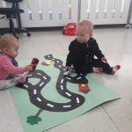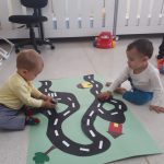 As crianças ( em dupla) ficaram com um carrinho cada uma. Elas tinham que andar com carrinho para fazer o percurso da pista. Como são pequenas, algumas crianças entenderam o comando da atividade e as outras ficaram com o carrinho fora da pista.