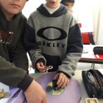 Apresentei a eles que com alguns tipos de lixos que serão descartados, como o papelão, CD, pedaços de EVA, caneta sem tinta, podemos com a criatividade transformar num material bem interessante para usarmos em vários conteúdos em sala de aula.