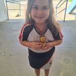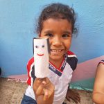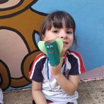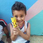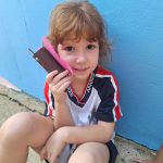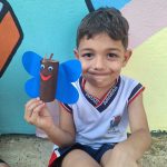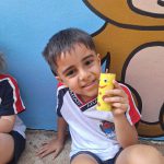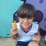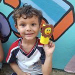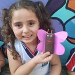 Criança apresenta o seu brinquedo reciclável feito de rolo de papel higiênico