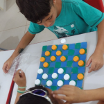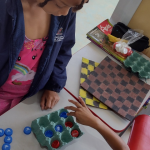 Foi realizado uma oficina de brinquedos com materiais reciclados, papelões e caixa de ovos, materiais da merenda escolar que iriam para o lixo, e as tampinhas trazidas pelos alunos.