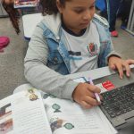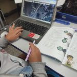 Na atividade registrada na imagem, o(a) aluno(a) está utilizando recursos digitais e analógicos para aprofundar seus conhecimentos sobre localização e orientação espacial no contexto do projeto ARTERIS, que aborda questões relacionadas ao trânsito. Com o auxílio de imagens de satélite por meio do Google Maps (GPS) no computador, o(a) estudante analisa o território ao redor da escola, identificando vias, áreas urbanas e trajetos de deslocamento. Ao lado, no caderno, observa-se o uso da bússola como instrumento complementar para compreender a noção de pontos cardeais e direção. A proposta integra tecnologia e geografia com o objetivo de promover reflexões críticas sobre mobilidade urbana, segurança no trânsito e o cotidiano dos deslocamentos escolares.