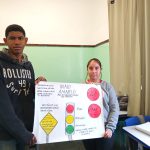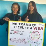 Os alunos do 9° ano , após discutirem em sala de aula e em apresentação sobre o assunto, resolveram junto com a professora realizarem um campanha para conscientizar a escola e todas as pessoas que trabalham  nela. fizeram debates na sala e depois cartazes e em seguida foram às salas de aula com os cartazes  passando informações de conscientização no trânsito e para a escola toda. expuseram o que aprenderam e também colaram seus cartazes nos corredores da escola, além de levarem informações para casa.