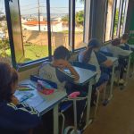 Os alunos após a conversa inicial fizeram uma atividade pratica na sala de aula de produção de texto individual e desenhos sobre o trânsito.