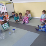 Cantando e se divertindo com material reciclável.