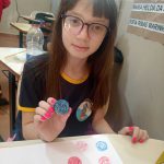 Com os carimbos prontos, os alunos os mergulharam em tinta guache e fizeram impressões em folhas de papel, criando composições coloridas e criativas.
