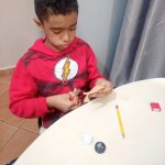 As crianças desenharam diferentes formas e figuras — como corações, flores, estrelas e animais — em pedaços de papel ou EVA, que foram depois colados sobre as tampinhas.