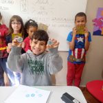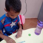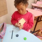 Durante a atividade, cada aluno recebeu tampinhas de garrafa plástica para criar seu próprio carimbo.