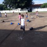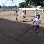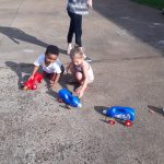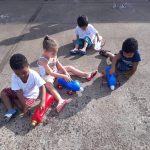 Construí com os alunos carrinhos com vidros de amaciante e as rodinhas com tampas de massa de tomate. Em uma roda de conversa falei com os alunos a questão do semáforo, cinto de segurança, faixa de pedestres, respeito ao volante e levei-os a brincar na quadra com os carrinhos de recicláveis, carrinhos de brinquedos.