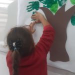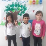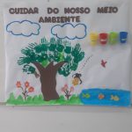 A aula de hoje foi muito criativa, fizemos um cartaz coletivo, cada criança carimbou sua mãozinha com guache, formando assim a copa da árvore, colamos copinhos coloridos para representar as lixeiras de reciclagem. Pintamos um rio com peixinhos, colamos abelha, passarinho, enfim ficou lindo!