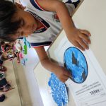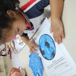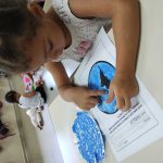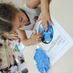 Em seguida, partimos para uma atividade artística: cada criança pintou o planeta Terra com tinta azul usando os dedinhos, representando os oceanos e mares que cobrem grande parte do nosso mundo. Essa vivência sensorial proporcionou momentos de descoberta, expressão e muita diversão, enquanto reforçava o cuidado com o nosso planeta.