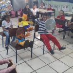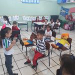 Na interação com as salas conversamos com as crianças sobre o perigo do celular e o uso do álcool quando vamos dirigir. Simulamos uma criança dirigindo seu carro e usando celular, nosso objetivo foi de mostrar que enquanto dirigimos temos que nos concentrar, não podemos nos distrair pois podemos atropelar pedestres e causar vários acidentes e arriscar nossas próprias vidas e de outras pessoas. As crianças contaram que quando tocar o celular é só encostar e parar o carro e atender o celular num local seguro. Mas alguns comentaram que o pai atende o celular mesmo dirigindo. Por fim, as crianças confeccionaram um celular e na hora da saída entregaram para os seus pais com um recadinho muito importante.