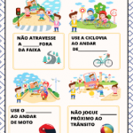Após a roda de conversa, realizar a atividade das charadas sobre algumas atitudes que devemos observar ao andarmos nas ruas. Explicar para as crianças sobre as normas e regras do trânsito.