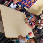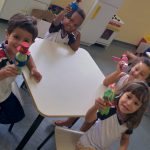 A professora Taiane junto com seus alunos desenvolveram um chocalho de garrafinhas plásticas.