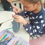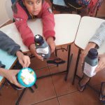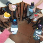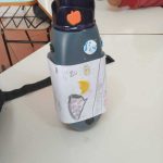A professora iniciou a aula explicando o que é um chocalho, suas origens culturais e seu uso como instrumento de percussão. Em seguida, foi proposta a construção de chocalhos usando embalagens recicladas trazidas pelos próprios alunos de casa, junto com milho seco como elemento sonoro.