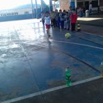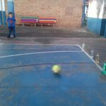 Foi colocado na linha de fundo da quadra algumas garrafas pet, onde ao sinal da professora o aluno devia chutar a bola e derrubar a garrafa.