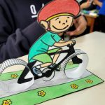 Para concluir, realizaram a montagem de uma escultura de papel representando um ciclista e sua bicicleta.