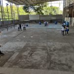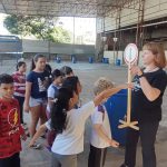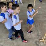 Atividade: as placas de trânsito foram distribuídas pela quadra, simulando ruas, rotatórias, semáforo e os alunos foram distribuídos em grupos de 4 pessoas, como se estivessem num carro. Cada grupo de alunos deveriam circular pelo circuito, obedecendo as placas de trânsito. A professora observava os alunos e orientava quando necessário.