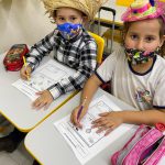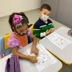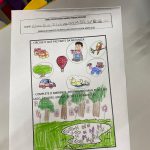 Já na segunda parte, as crianças completaram o ambiente desenhando mais peixes no lago, árvores, grama, flores e borboletas.