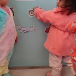 Coloquei alguns meios de transporte com fita adesiva na parede da sala e destinei um cantinho só para esse tema. Após algumas cantigas que envolvem carros, trenzinhos e aviões, nos dirigimos ao cantinho dos meios de transporte e iniciei uma série de perguntas provocativas: Cadê a moto? Onde eu ando de navio? Como o trenzinho faz? Vamos imitar um avião? Onde o avião anda?