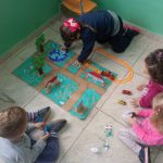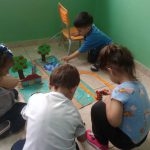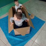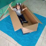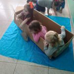 No dia 23 de setembro a turma do maternal 1 da professora Andressa desenvolveu a atividade de classificação dos meios de transporte por tipo. A professora contou a história do menino que ia para casa de ônibus, passeava de carro com os pais e um dia foi viajar de avião para visitar a tia que morava bem longe. Revisou com os alunos quais são os meios de transporte que as crianças conhecem, quais são aquáticos, quais são os aéreos e os terrestres. Então relembrou com as o cartaz feito na aula anterior, da rua e o lago, mostrou para as crianças os brinquedos dos meios de transporte (carro, barco, trem, avião) e perguntou para a turma sobre cada um deles, se voa, navega ou se locomove pela rua. Em seguida chamou a turma, em pequenos grupos para brincar de classificar os meios de transporte colocando cada um no lugar apropriado (os carros na rua, barcos na água e aviões no ar – pendurados com uma fitinha). Para concluir, os alunos brincaram de remar o barco (caixa de papelão em cima do TNT).