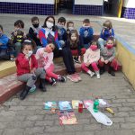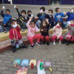 Após roda de conversa com as crianças sobre o lixo e a coleta seletiva, também trabalhado anteriormente, a professora distribuiu saquinhos de lixo confeccionados com papel sulfite onde dentro simulava tipos de lixo (papel, metal, plástico, orgânico e vidro).