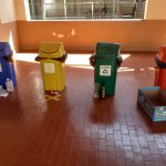 Na azul, colocamos papel, na amarela metal, na vermelha plástico, na preta borracha, na marrom, orgânico.E na verde o vidro.