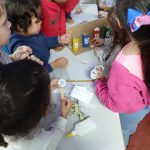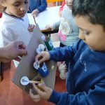 A atividade teve início com a disponibilização de materiais de pintura, como tintas e rolinhos de papel higiênico. Após a pintura, as crianças, com o auxílio da professora, identificaram e colaram símbolos representando diferentes tipos de materiais recicláveis. Em seguida, realizaram a pintura e o recorte de figuras de diversos materiais (como plástico, papel e alumínio). A partir dessas figuras, a professora explicou as cores correspondentes da coleta seletiva, e as crianças começaram a classificá-los corretamente, promovendo a conscientização sobre reciclagem e sustentabilidade de forma lúdica e prática.