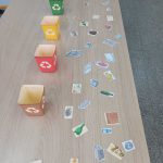 Na nossa sala de aula fizemos uma dinâmica bem interessante usando imagens de lixo e os cestos com suas cores correspondentes. Cada criança pôde colar o lixo dentro da cesta com a cor correta. Também fizemos atividades individuais e em grupos para que fixassem melhor a aprendizagem. Eles aprenderam muito e irão levar para vida toda!