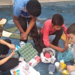 Na escola o trabalho é diretamente com os alunos, onde eles vivem o que é a coleta seletiva na prática, saindo da teoria e vivendo a prática da ação.