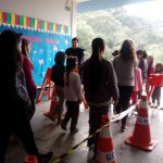 Após a conversa realizada na sala de leitura, os alunos foram encaminhados para a área externa, onde foram colocados alguns cones e faixas de isolamento, simbolizando uma área segura para a travessia, os alunos também foram orientados com sinais sonoros e gestos pelo guarda, o mesmo através de dinâmica demonstrou como as pessoas devem atravessar ou trafegar de forma segura nas vias públicas do bairro, na rodovia e em áreas mais movimentadas do município.