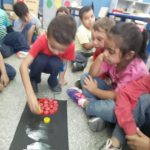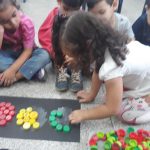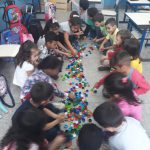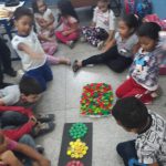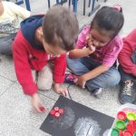 Inicialmente foi feito uma roda de conversa onde falamos sobre o semáforo, para que serve e como é utilizado, em seguida os alunos fizeram a separação de tampas de garrafa pet, separando-as pelas cores do semáforo, depois em um pedaço de papelão pintado de preto a professora fez três círculos nos quais os alunos fizeram a colagem de tampinhas respeitando as cores.