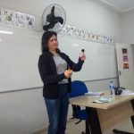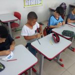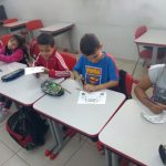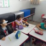 Levei para os alunos o molde de uma viseira. Essa viseira contém a frase: “Educação no Trânsito – Eu Participo”. Cada aluno pintou a viseira a seu modo, colou numa cartolina, recortou e depois, com a minha ajuda foi colocado o elástico. O objetivo dessa viseira é que os alunos usem para chamar a atenção das pessoas e mostrar que estão sendo educados para um trânsito mais seguro. Então, perguntei aos alunos qual seria o melhor momento de usar essa viseira e, depois de discutirem, sugeriram usar no dia do passeio no entorno da escola, onde observaremos a sinalização de trânsito existente. Ficou assim combinado.