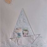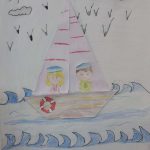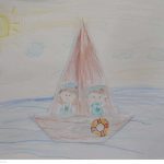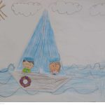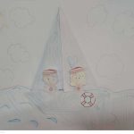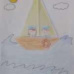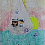 Em seguida, receberam um molde contendo a figura de um casal de marinheiros e uma boia salva-vidas, que foi pintado e recortado pelos alunos. Após essa etapa, os elementos produzidos — o barco, o casal de marinheiros e a boia — foram organizados e colados em uma folha em branco.