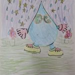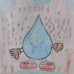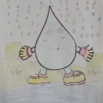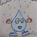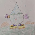 Após a etapa de pintura, os alunos recortaram e montaram sua gotinha, organizando as partes do corpo. Por fim, produziram um desenho de cenário, no qual inseriram a gotinha em um contexto relacionado à água, como rios, mares, chuvas ou outros ambientes aquáticos.